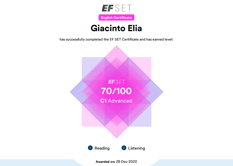 Possiedo una certificazione linguistica EF C1 Advanced, che garantisce una padronanza avanzata della lingua inglese in ambito professionale.