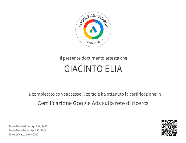 Ho ottenuto la certificazione Google Ads Search rilasciata da Google, che attesta competenze nella gestione strategica delle campagne pubblicitarie sui motori di ricerca.