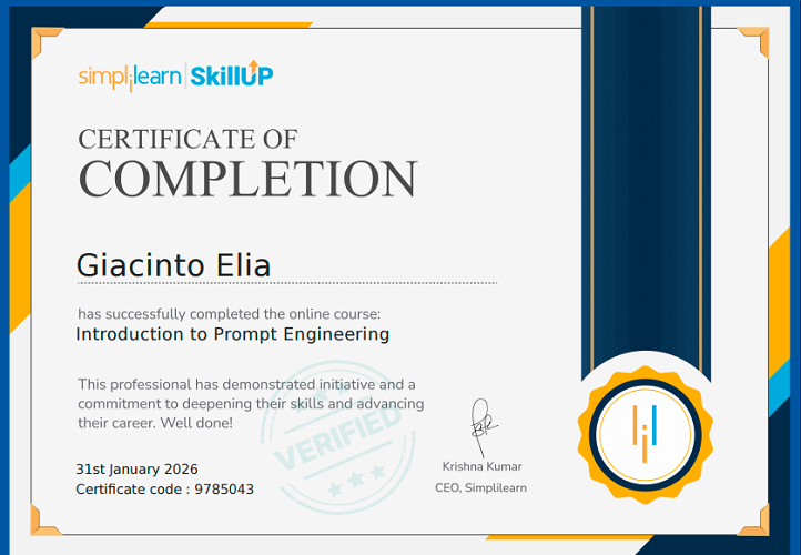 Sono certificato in Prompt Engineering, con competenze nella progettazione, ottimizzazione e controllo dei prompt per modelli AI avanzati.