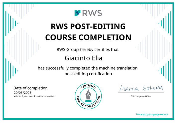 Ho completato il percorso RWS Post-Editing, specializzato nella revisione e ottimizzazione di contenuti generati da machine translation.