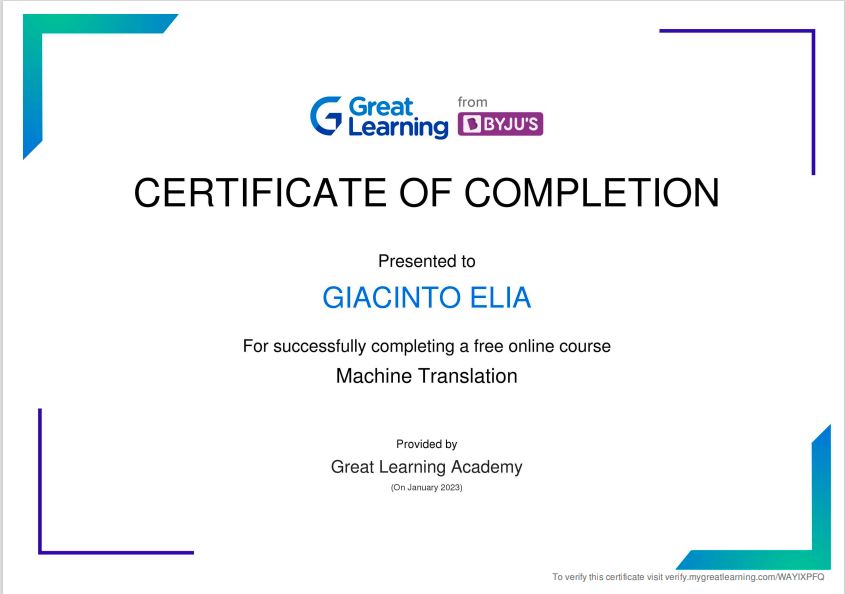 Possiedo competenze certificate in Machine Translation, applicate alla qualità e all’affidabilità dei contenuti multilingua.